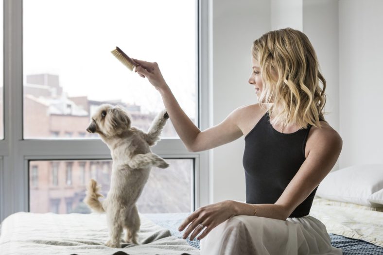 “The best way to brush out matted hair is to separate tangles by line-brushing the dog with a slicker brush and always follow through with a stainless-steel comb,” says Nicole.