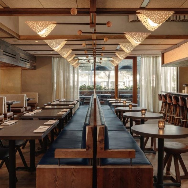 The room is also punctuated by a large private dining area, as well as a chef’s table featuring a large, blue fringe light fixture.