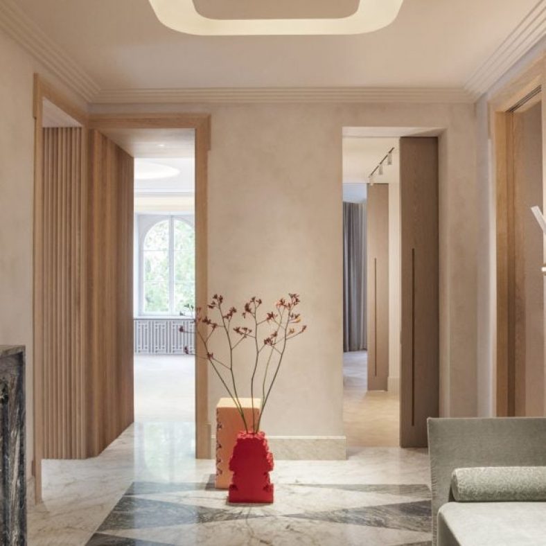 The studio used a materials palette of marble and different types of wood to create a calm atmosphere in the flat and match the other materials used in the building.