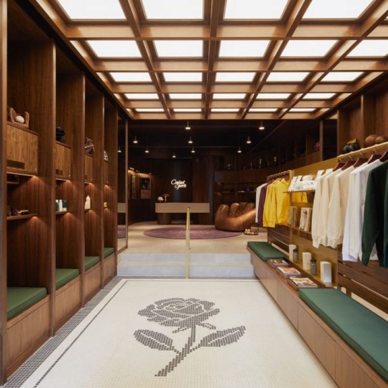 Beyond, dark walnut panelling, brass rails and shelves, and green cushions give the store a collegiate atmosphere, while mosaic floor tiles and baskets of towels evoke a locker room.
