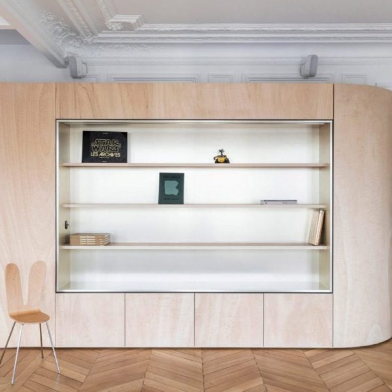 Parisian firm h2o Architectes opened up its floor plan to make the most of the top-floor views while installing wooden bookshelves to define different areas and house the extensive library of the apartment’s book-loving owner.