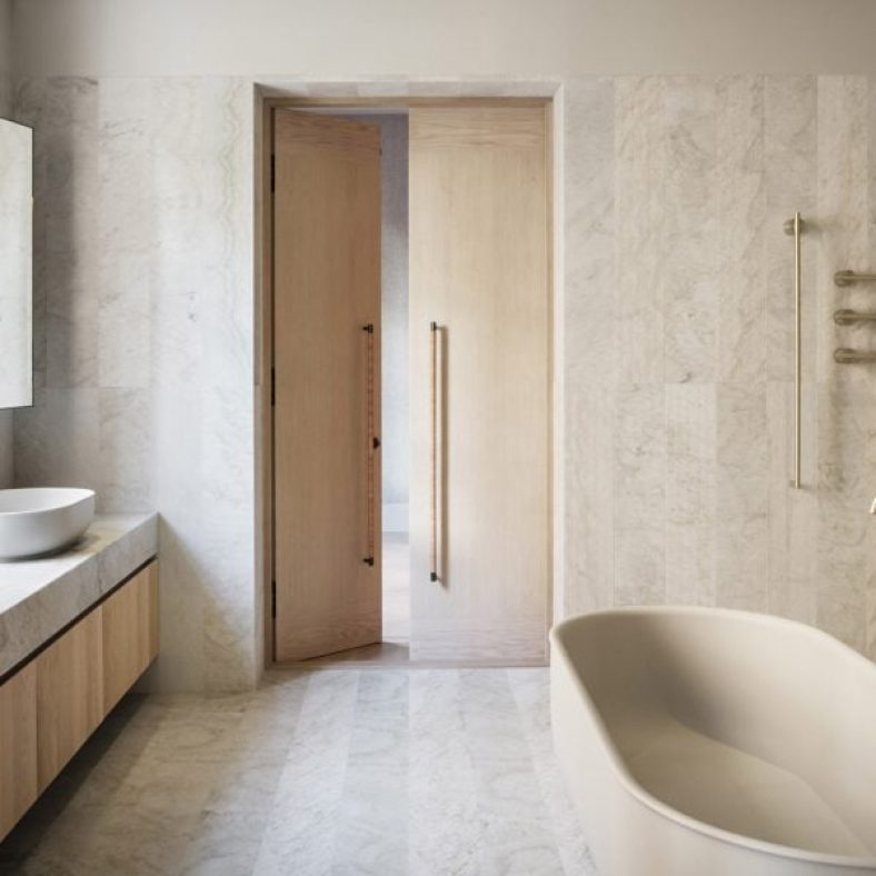 For the main bathroom, the designers opted for a pale Swedish marble known as Ekeberg. Some slabs were polished, while others were milled in different directions to create a subtle chequered pattern.