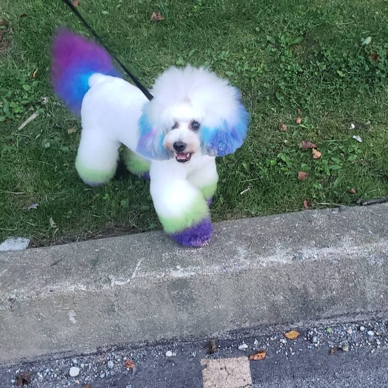 It’s trendy to add bright colors to your hair. So why not let your pooch ride this beauty wave, too, with pet-safe dye? You can color-match with your dog for special occasions, seasonal fun and sporting events.